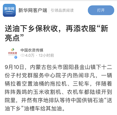 9月28日,人民日报客户端、新华网客户端刊发《送油下乡保秋收,再添农服“新亮点”》,报道了中农集团旗下中国供销石油公司首次联合地方供销社在市级范围开展送油下乡,大幅提升了服务范围和针对性,成为中农集团开展为农服务工作的新亮点和大胆创新。