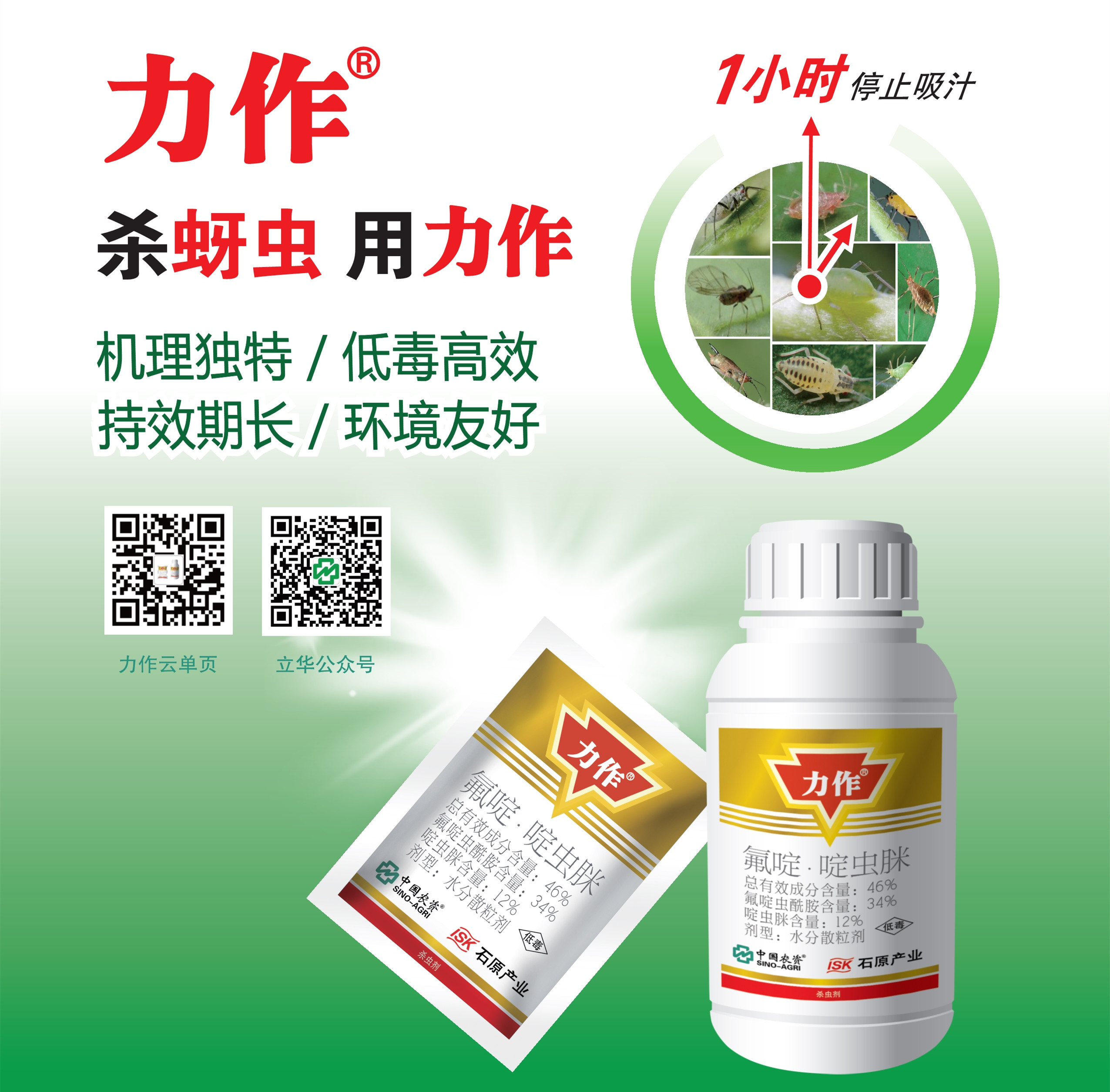 中农立华通过筛选研究,针对蚜虫靶标推出“力作”(46%氟啶·啶虫脒WDG)。对蚜虫有突出杀灭效果,而非靶标对象如蜜蜂、瓢虫、草蛉等蚜虫天敌安全,可以在防治害虫的同时,保护田间生态,做到对环境友好。