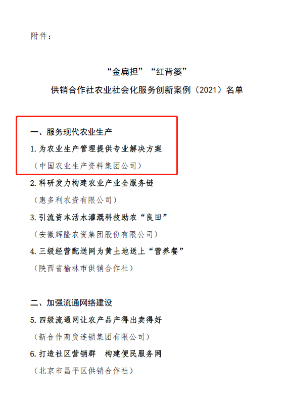 12月17日,“金扁担”“红背篓”供销合作社农业社会化服务创新案例(2021)正式发布。在25个案例中,中农集团入选供销合作社“服务现代农业生产”创新案例。近期农业农村部办公厅印发《关于全国农业社会化服务创新试点单位的批复》(农办经〔2021〕15号),中农集团旗下中农吉星现代农业技术服务有限公司、河北新合作裕丰农业发展有限公司被确定为全国农业社会化服务创新试点单位。