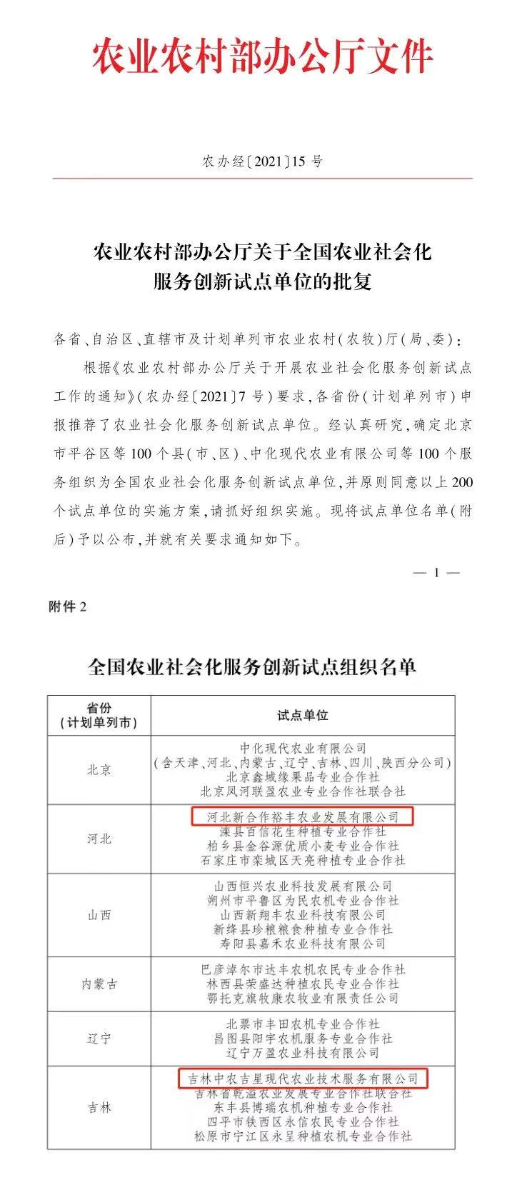 中农吉星、河北新合作裕丰农业公司被农业部确定为全国农业社会化服务创新试点单位