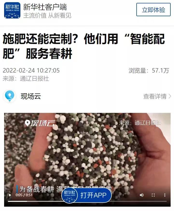 2月24日,新华社客户端刊发《施肥还能定制?他们用“智能配肥”服务春耕》,报道了中国农资®·(通辽)服务中心在当地春耕来临之前便深入市场,调查农民种植情况,采集土壤样品,接受农民订单,然后有计划地生产配方肥,高质量地保障当地春耕绿色生产。