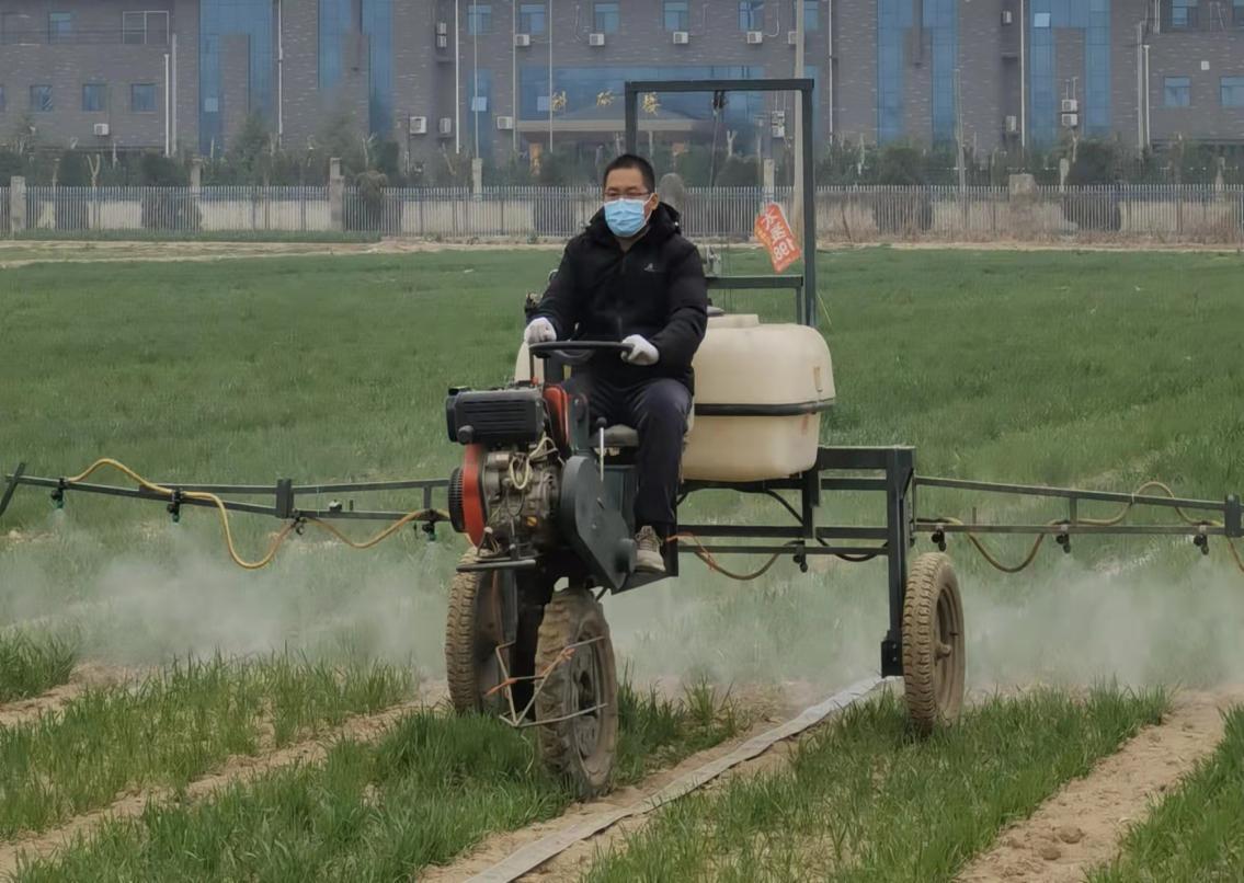 在山东聊城现代农业示范园区内,山东中农汇德丰种业公司技术人员操作自走式打药机,对300亩育种试验田进行农药喷洒作业,精心培育优质小麦良种。