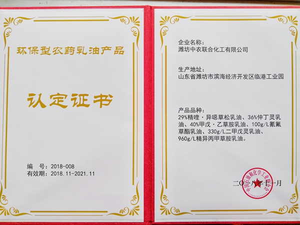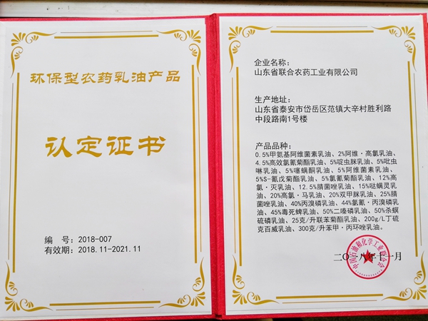 山东中农联合旗下29个乳油产品获得“2018年度环保型农药乳油产品”认证