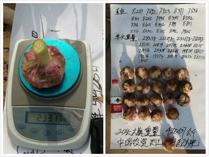 鱼台县鱼城镇卜桥村、金乡县高河街道魏楼村两处示范田实地测产显示:与常规施肥方案相比,农户使用中国农资的大蒜配方控释肥后,蒜头大且均匀,商品率较高,亩产量可达3200——3700斤(折合干蒜),比去年增产500斤/亩以上,增产效果显著,获得了当地蒜农们的认可。