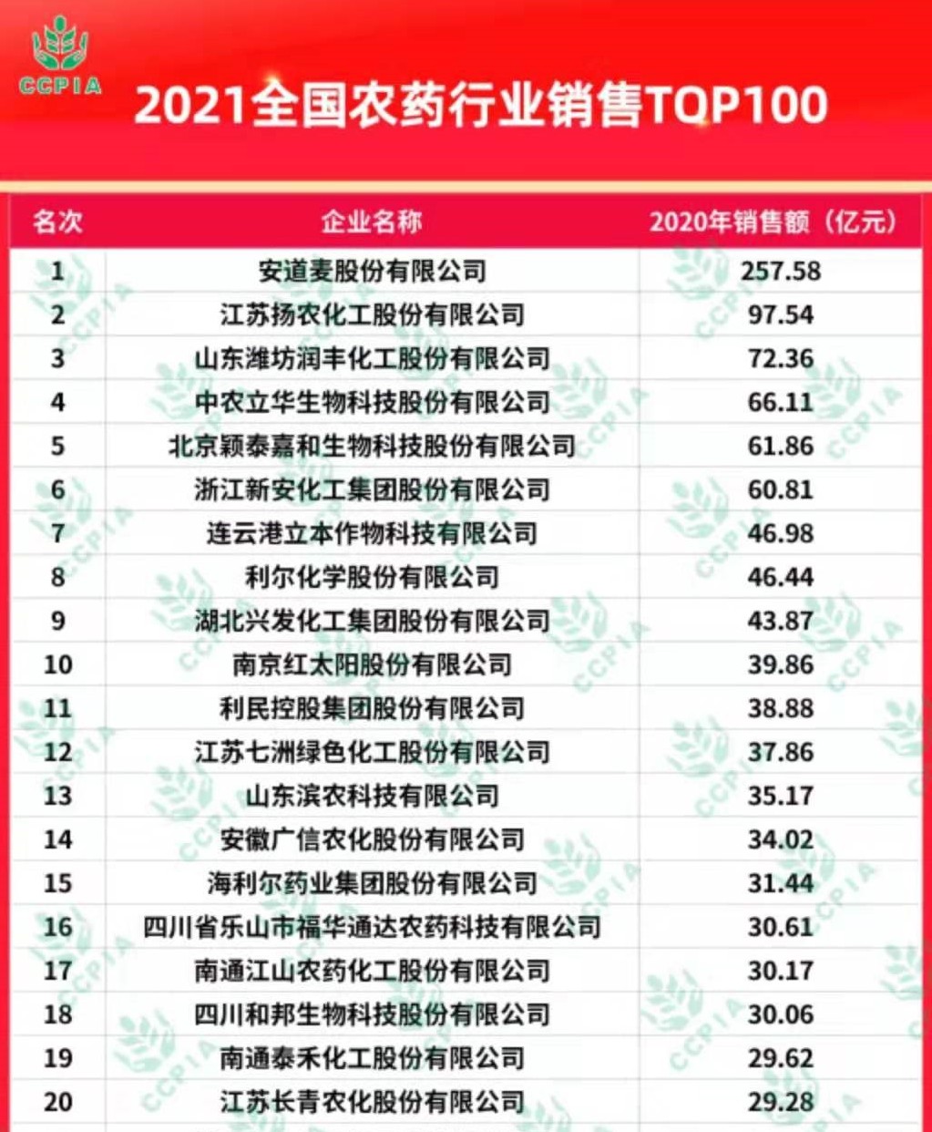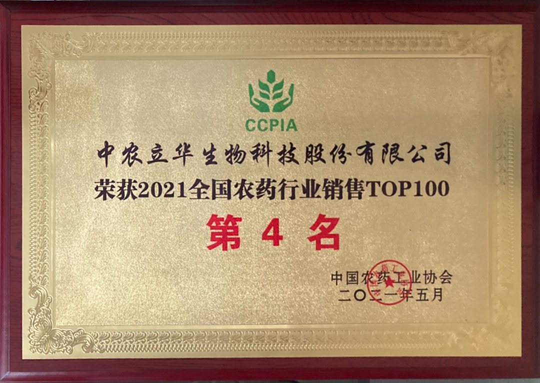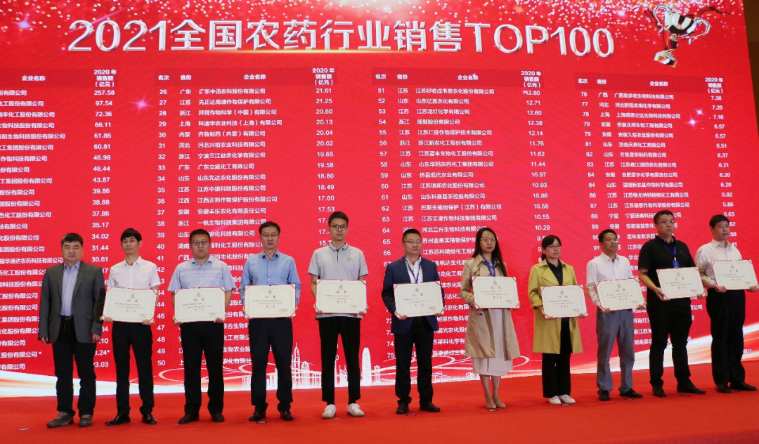 5月12日,在安徽合肥举办的第八届农药行业经济运行分析会暨农药行业排行榜发布会上,中国农药工业协会发布了“2021全国农药行业销售TOP100”等榜单。中农立华生物科技股份有限公司以66.11亿元的销售额荣获第四名。