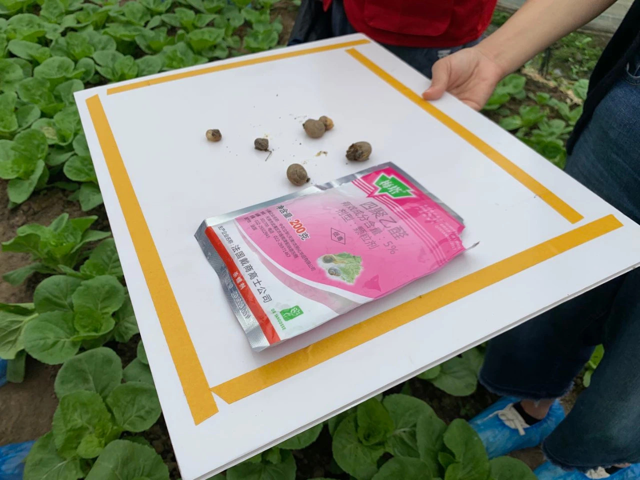 “随着4月以来气温升高、雨水增多,当地菜园子里蜗牛危害严重。”服务中心技术人员龚邱继说,梅塔药剂内含诱导剂、催吐剂,可有效诱导灭杀蜗牛、福寿螺等软体动物,具有杀螺效果好、杀螺彻底、可重复杀螺等特点。毛白菜的生长周期45天,梅塔药效可达20天以上,只需在田间施撒两次就可以保障毛白菜的整个生长周期,具有高效环保的特点。