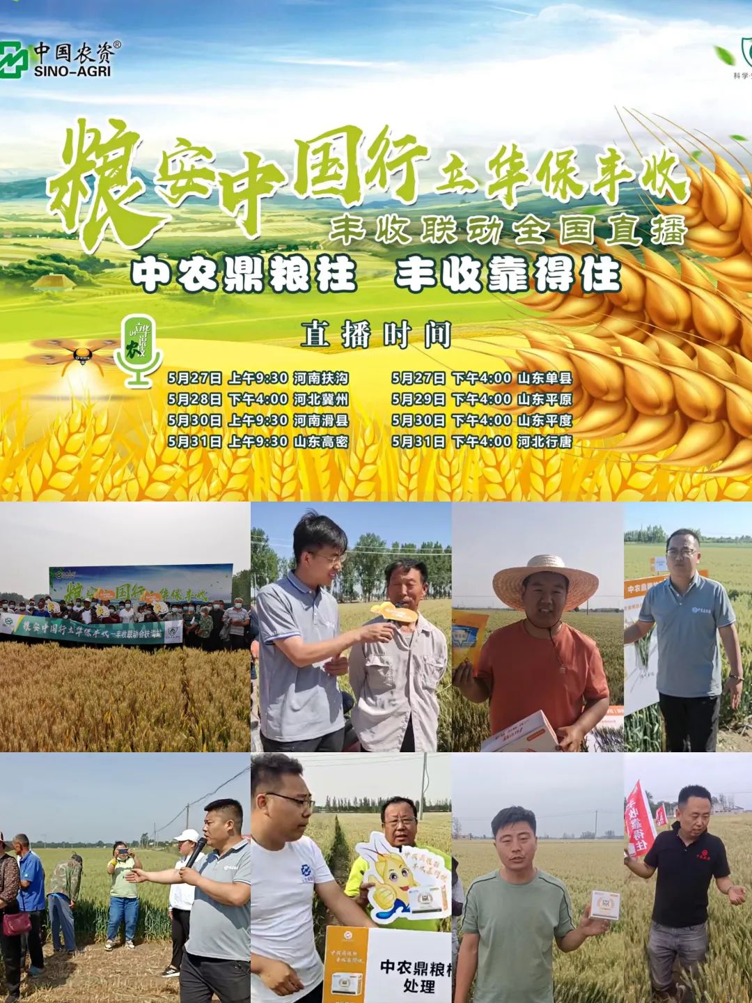 风吹麦浪,丰收在望。5月27日至31日,由中农立华举办的“粮安中国行 立华保丰收”系列直播活动在河南、河北、山东小麦主产区的8个乡镇成功举办。来自线上线下的4000多名种植户齐聚一堂,共同分享中农方案带来的丰收喜悦。