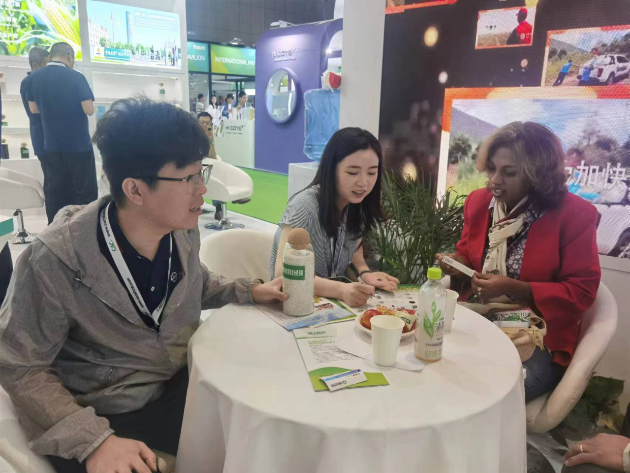 展会现场,中国农资“绿色家族”系列产品——液体缓释氮肥、海藻寡糖、植物免疫蛋白、氨基酸系列、微生物系列、有机+无机等绿色产品悉数亮相,吸引了众多展商代表驻足观看,业务团队为前来咨询的国际友人详细介绍公司优势,来自马来西亚、印度、韩国、新加坡等国家的新老客户走进公司展台洽谈交流。