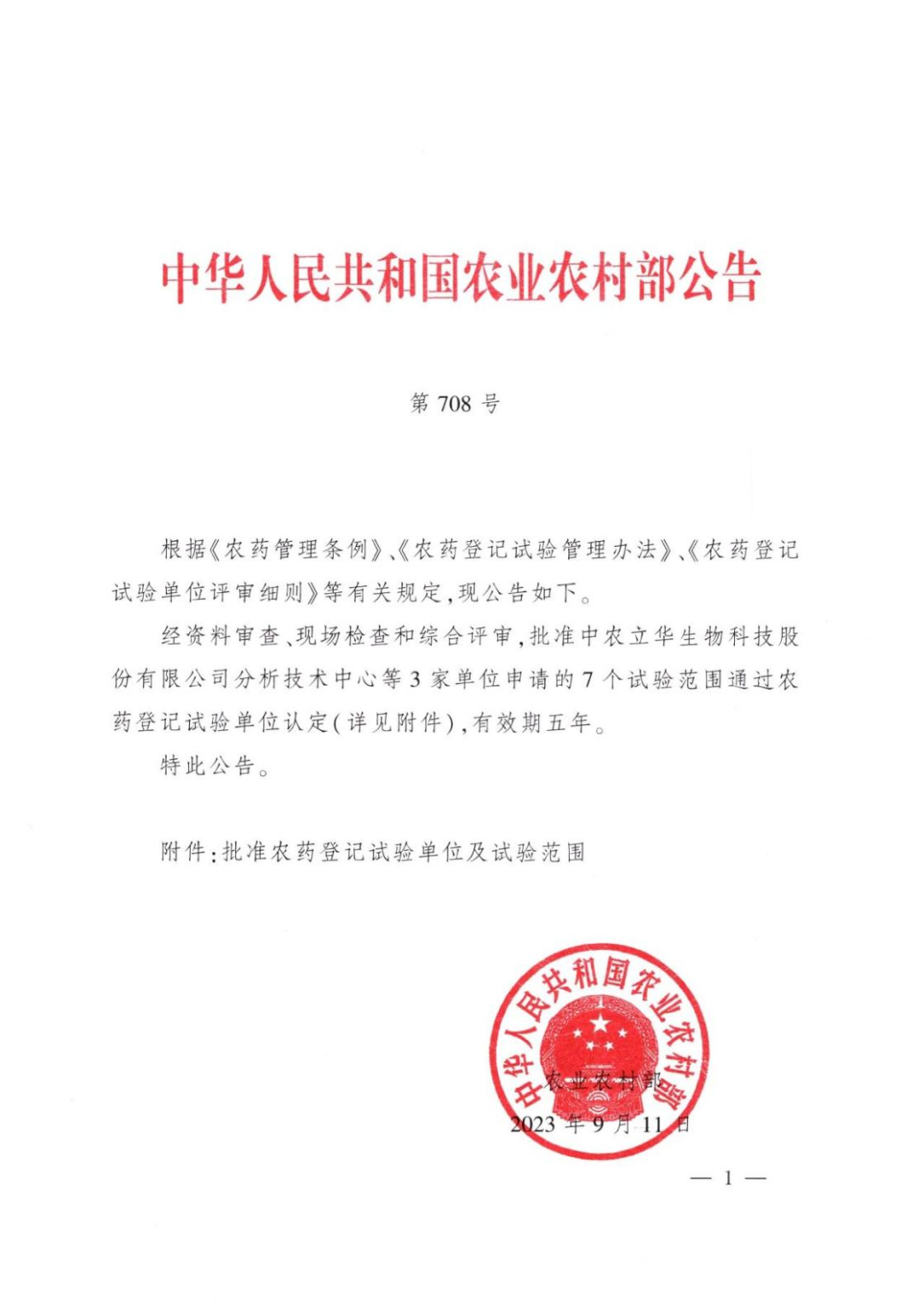 9月13日,中华人民共和国农业农村部发布了第708号公告,批准中农立华生物科技股份有限公司分析技术中心申请的2个试验范围通过农药登记试验单位认定。