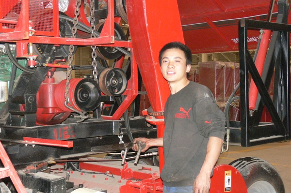 中农博远二分厂试制班的王龙,是位精干开朗帅气的小伙子,岁数不大在公司却已经兢兢业业的干了五个年头,不仅是车间试制班的骨干力量,更是每年秋收服务的排头兵,喜欢他的同事给了他个绰号“老博远”。新疆、陕西、山西、甘肃,几年来他几乎跑遍每一个有中农博远玉米收割机的地方。