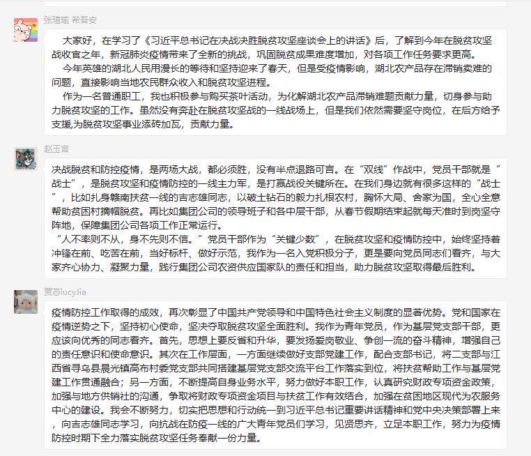 近日,中农集团青年学习小组开展了线上交流讨论活动,大家围绕习近平总书记关于疫情防控工作的系列重要讲话和指示批示精神、在决战决胜脱贫攻坚座谈会上的重要讲话、给北京大学援鄂医疗队全体“90后”党员的回信,以及供销总社《关于开展向吉志雄同志学习的通知》等内容踊跃交流了心得体会。