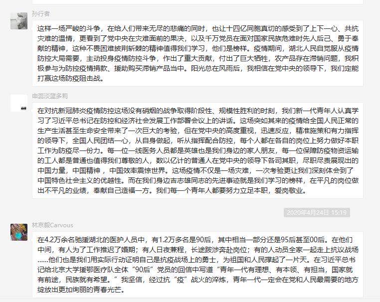 通过交流,大家一致认为,党和国家用最快的速度、最有效的方式、最无私的奉献精神和最全局的调配管控在最短的时间内遏制了疫情,为世界人民赢得了宝贵时间,再次彰显了中国特色社会主义制度的独特优势。在这场人民战“疫”中,广大青年用实际行动充分证明,我们是有远大理想的一代,是有家国情怀的一代,更是能担当大任的一代。北京大学援鄂医疗队中的90后医护人员不畏艰险,不怕牺牲,英勇奋战在抗疫前线,他们用实际行动告诉大家,当代青年有理想、有本领,能担当。
