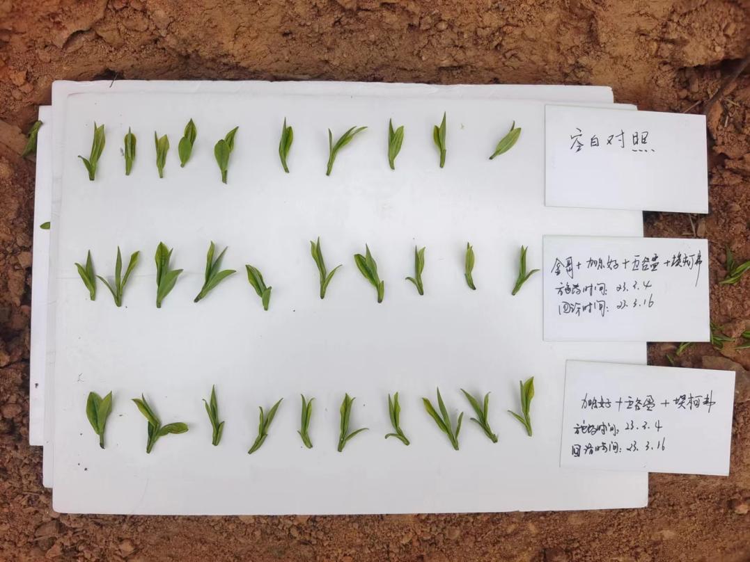 浙江团队在开展了大量试验示范的基础上,推出“中农埃加”防病增产方案,通过“植物营养+植物生长调节剂”双管齐下,助力茶树出芽整齐稠密,叶片厚实。茶叶产量提高的同时,上市时间也大大提前,茶农的种茶收益提升了15%以上。