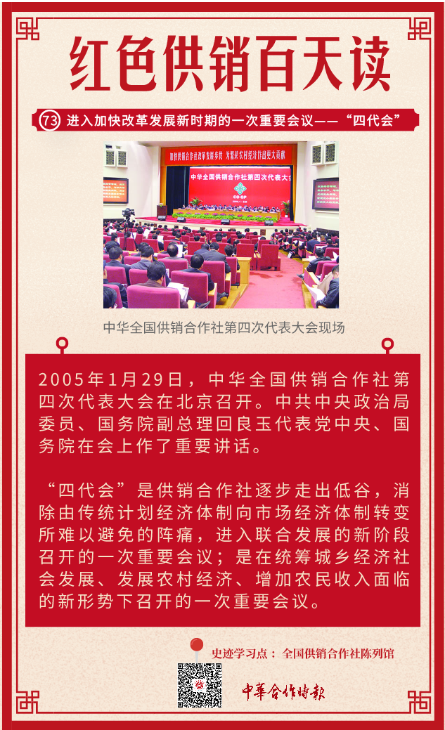 “四代会”是供销合作社逐步走出低谷,消除由传统计划经济体制向市场经济体制转变所难以避免的阵痛,进入联合发展的新阶段召开的一次重要会议;是在统筹城乡经济社会发展、发展农村经济、增加农民收入面临的新形势下召开的一次重要会议。大会强调,做好供销合作社工作,必须始终坚持为农业、农民和农村经济发展服务的宗旨,把供销合作社与农业和农村工作大局紧密结合起来,积极推进农业产业化和农业流通现代化,为政府分忧,为农民牟利。