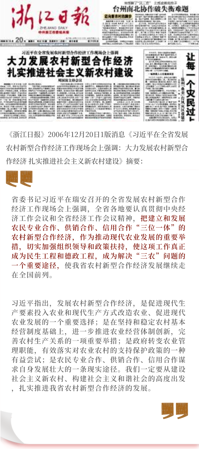 2006年1月,时任中共浙江省委书记习近平在全省农村工作会议上首次提出要“积极探索建立农民专业合作、供销合作、信用合作‘三位一体’的农村新型合作体系”。