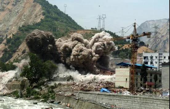 2008年6月1日14时17分,随着一声巨响,汶川县映秀镇供销合作社地震危楼被成功爆破拆除。(图片作者:闫军)