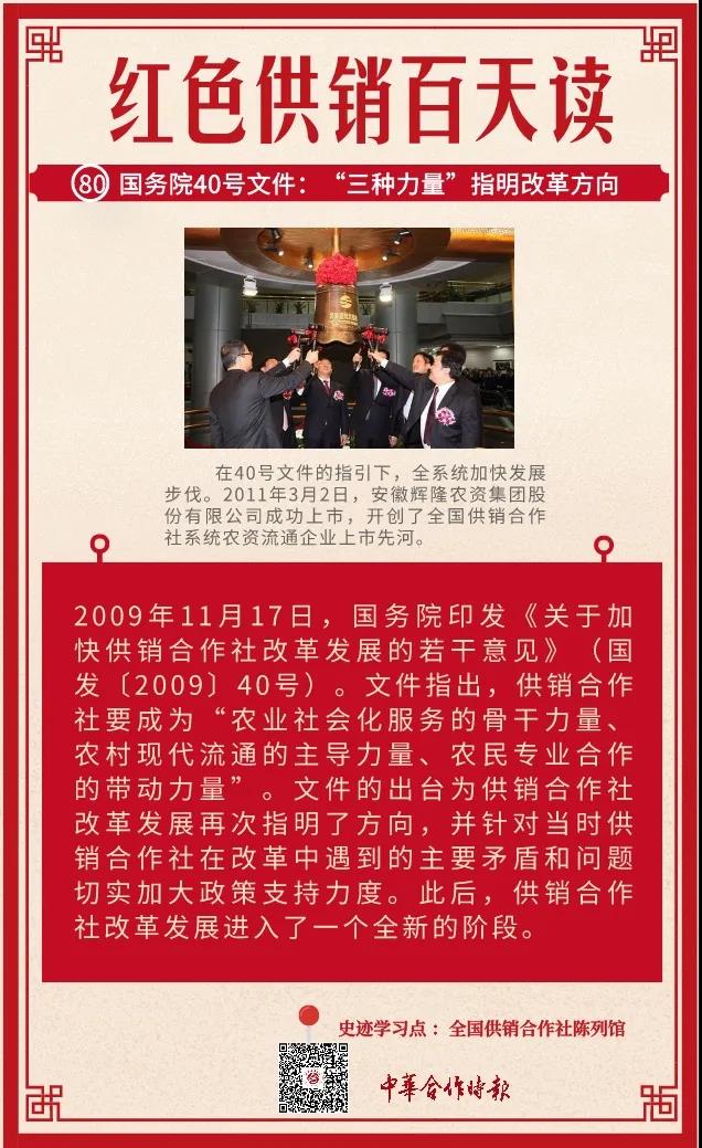 在40号文件的指引下,全系统加快发展步伐。2011年3月2日,安徽辉隆农资集团股份有限公司成功上市,开创了全国供销合作社系统农资流通企业上市先河。