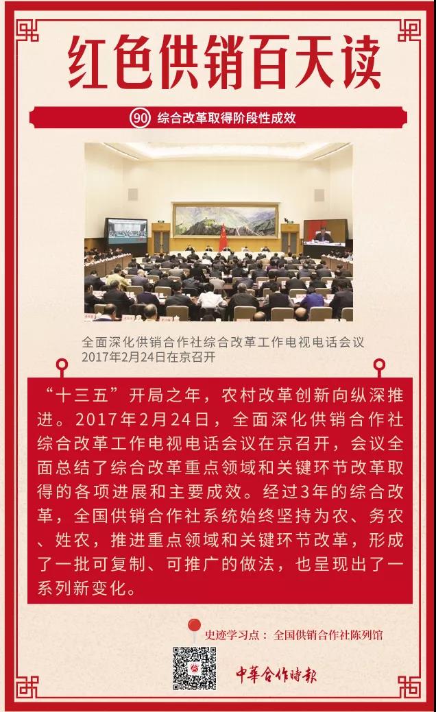 2017年2月24日,全面深化供销合作社综合改革工作电视电话会议在京召开,时任国务院副总理汪洋出席会议并讲话。汪洋充分肯定供销合作综合改革取得的成效,对下一阶段综合改革作出部署。时任中华全国供销合作总社党组书记、理事会主任王侠全面总结了综合改革重点领域和关键环节取得的各项进展,介绍了综合改革的主要成效。