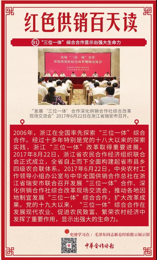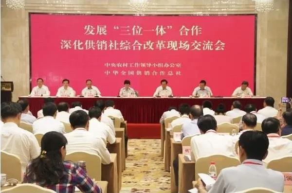 2017年6月22日,中央农村工作领导小组办公室、中华全国供销合作总社在浙江省瑞安市联合召开“发展‘三位一体’合作深化供销合作社综合改革现场交流会”。会议总结交流了浙江等地发展生产、供销、信用“三位一体”综合合作的经验做法,推动各地因地制宜发展“三位一体”综合合作,扩大改革成果。