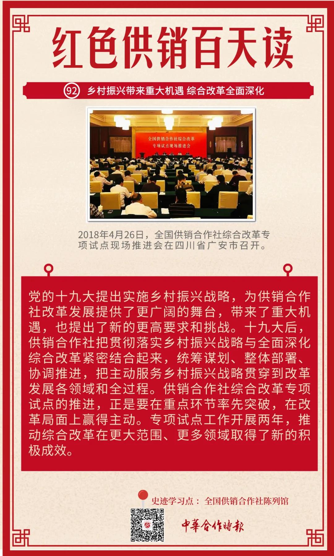 2018年是改革开放40周年,也是供销合作社综合改革向纵深推进的关键之年。2018年4月26日,全国供销合作社综合改革专项试点现场推进会在改革开放总设计师邓小平同志故乡四川省广安市召开。这次推进会也是党的十九大后,总社召开的第一次研究改革的全系统专题工作会议,对于新时代全面深化供销合作社综合改革具有特殊而重要的意义。