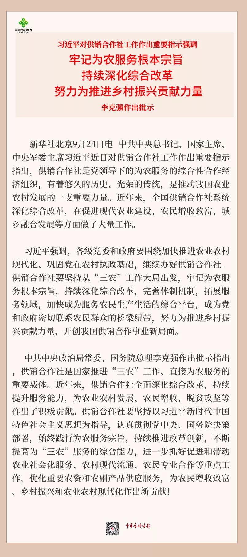 在我国即将夺取全面建成小康社会伟大胜利、踏上实现第二个百年奋斗目标新征程的历史时刻,2020年9月24日,中华全国供销合作社第七次代表大会在京隆重召开。大会召开前,中共中央总书记、国家主席、中央军委主席习近平对供销合作社工作作出重要指示,中共中央政治局常委、国务院总理李克强作出批示。中共中央政治局委员、国务院副总理胡春华出席会议并讲话。