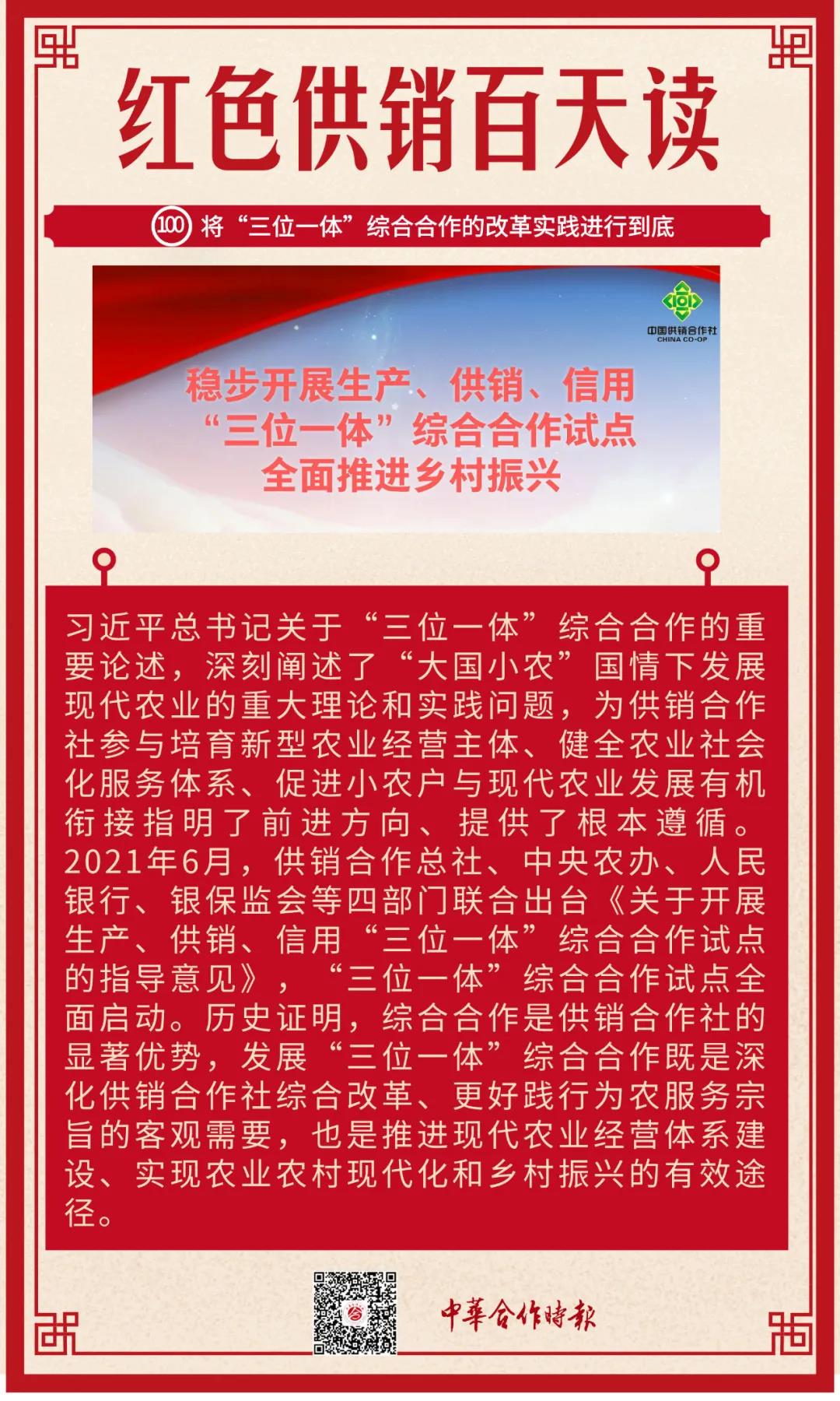 红色供销的百年发展史告诉我们,综合合作是供销合作社的显著优势,正是因为农业农村农民需要什么服务,供销合作社就提供什么服务,才让供销合作社有如此宽广的历史纵深。发展“三位一体”综合合作既是深化供销合作社综合改革、更好践行为农服务宗旨的客观需要,也是推进现代农业经营体系建设、实现农业农村现代化和乡村振兴的有效途径。站在“两个一百年”奋斗目标历史交汇点上,供销合作社唯有将“三位一体”综合合作的改革实践进行到底,才能加快成为服务农民生产生活的综合平台,成为党和政府密切联系农民群众的桥梁纽带,不断开创我国供销合作事业新局面,为全面推进乡村振兴、加快农业农村现代化、全面建设社会主义现代化国家作出新的更大贡献!