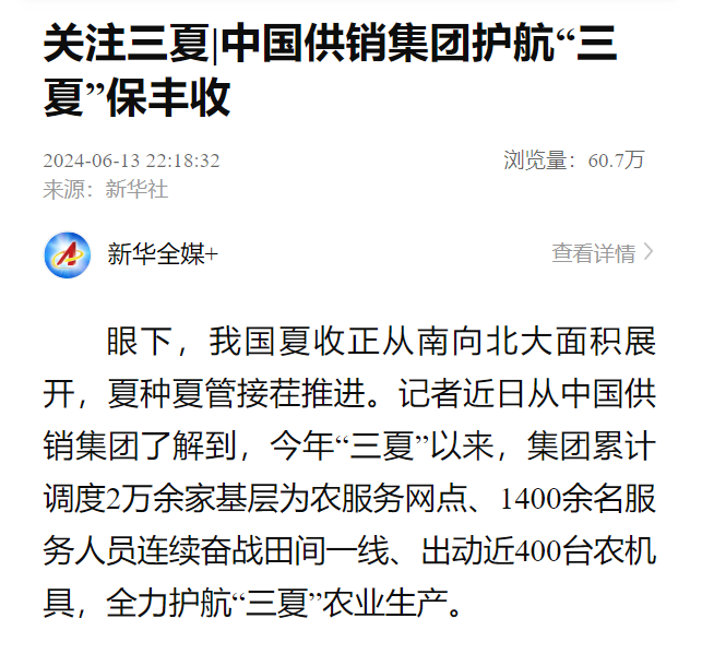 眼下,我国夏收正从南向北大面积展开,夏种夏管接茬推进。记者近日从中国供销集团了解到,今年“三夏”以来,集团累计调度2万余家基层为农服务网点、1400余名服务人员连续奋战田间一线、出动近400台农机具,全力护航“三夏”农业生产。